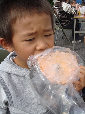 自分の顔ほどもあるせんべいにかぶりついています。(笑)