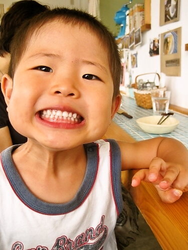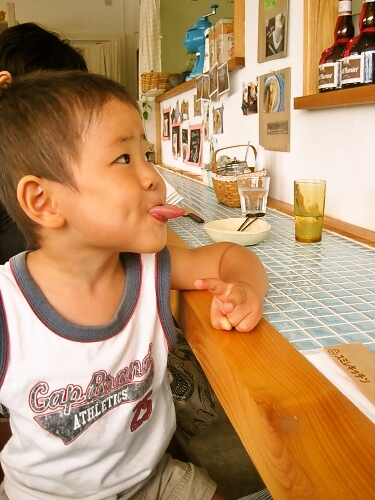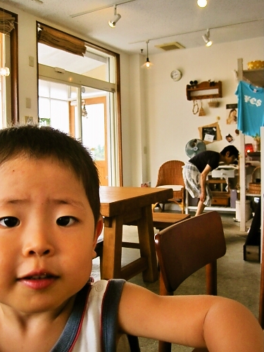 パステル&ウッディーな店内に超不釣合いな愚息っす。