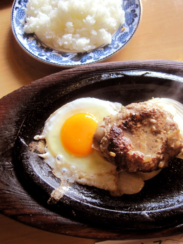 鉄板の上でジュージューと焼けるこのハンバーグです。