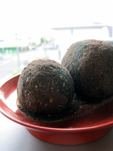 (ドロ団子の中に種を混ぜ込みます)