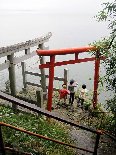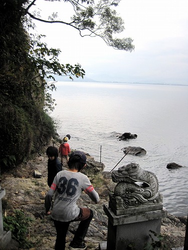 琵琶湖岸の鳥居に向かって瓦を投げる「かわらけ」です。